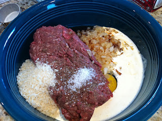 In a large bowl I have hamburger, panko breadcrumbs (use whatever you have, that's what I had), 1 egg, heavy whipping cream, worcestershire sauce, salt and pepper and the now cooled onions that I sautéed. (set the pan to the side, you'll need it in a minute.) Mix this with your hands, don't work it too much or the meatballs will turn out tough.